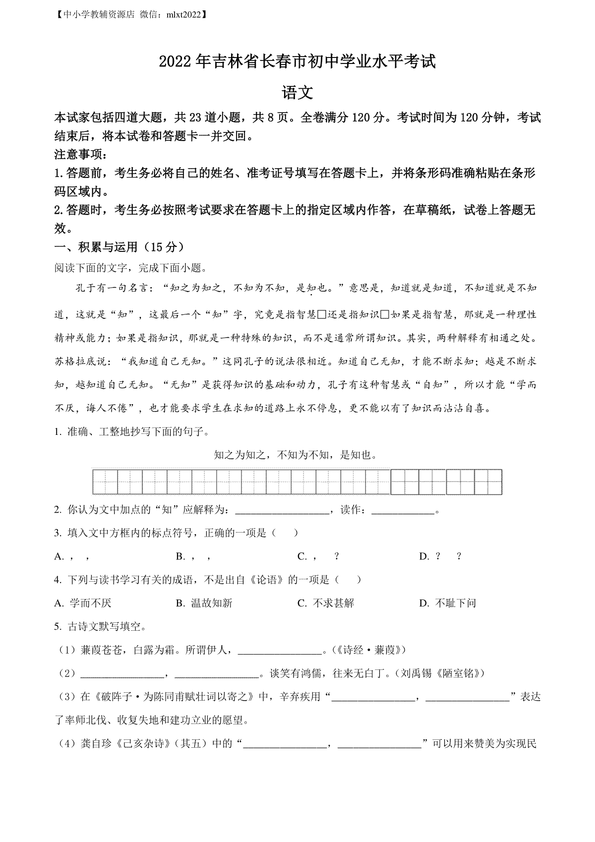 1.精品解析:2022年吉林省长春市中考语文真题(原卷版)