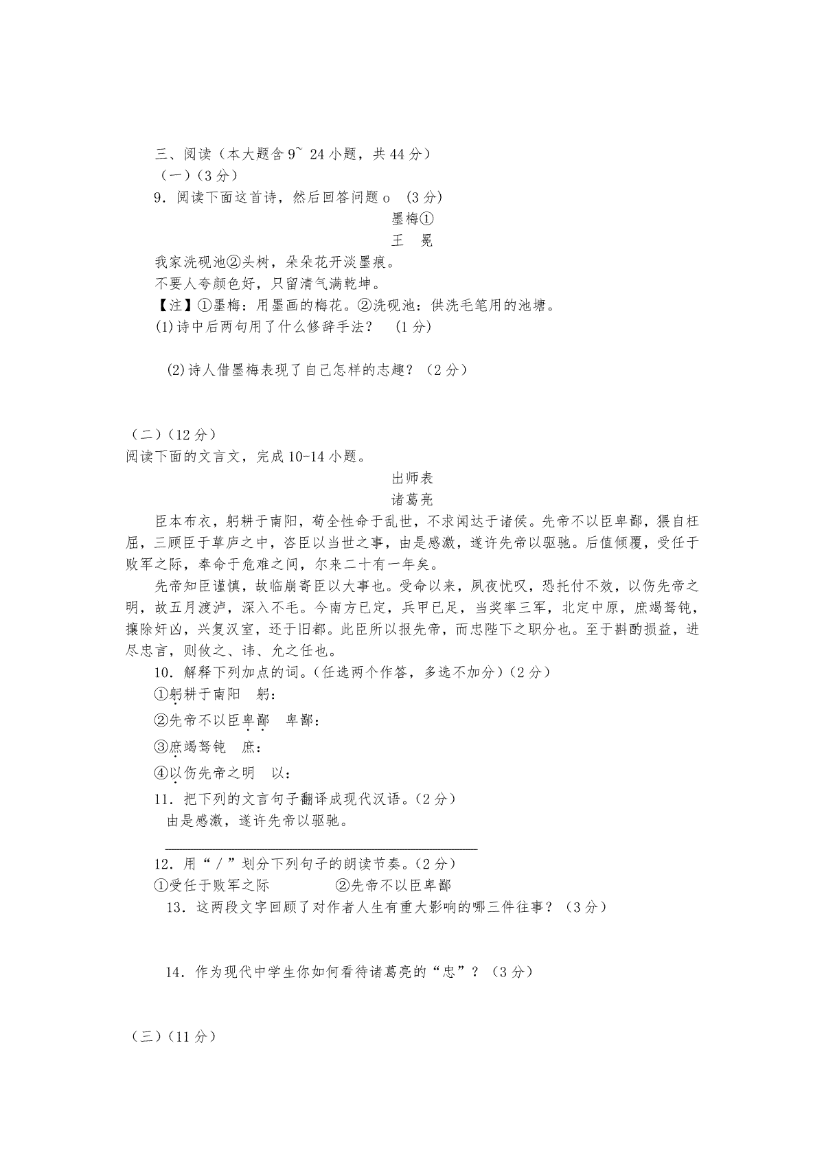 1.2009年云南省中招考试语文试题(word版,有答案)
