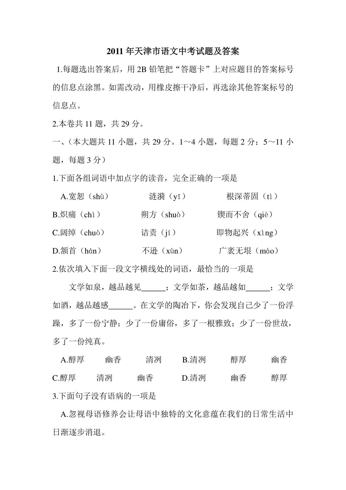 下载2011年天津市语文中考试题及答案PDF格式或doc