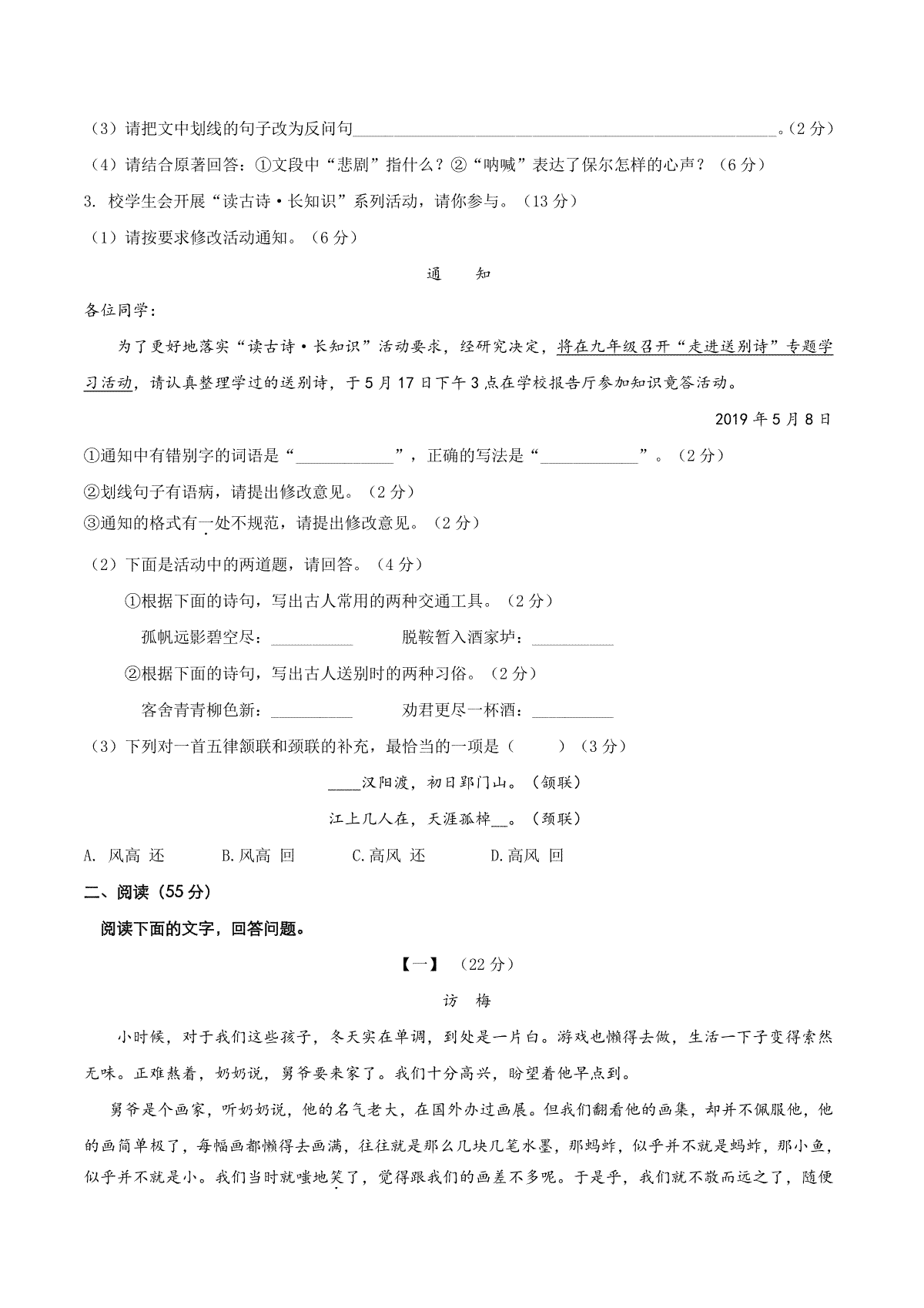 2019年安徽中考语文试题及参考答案
