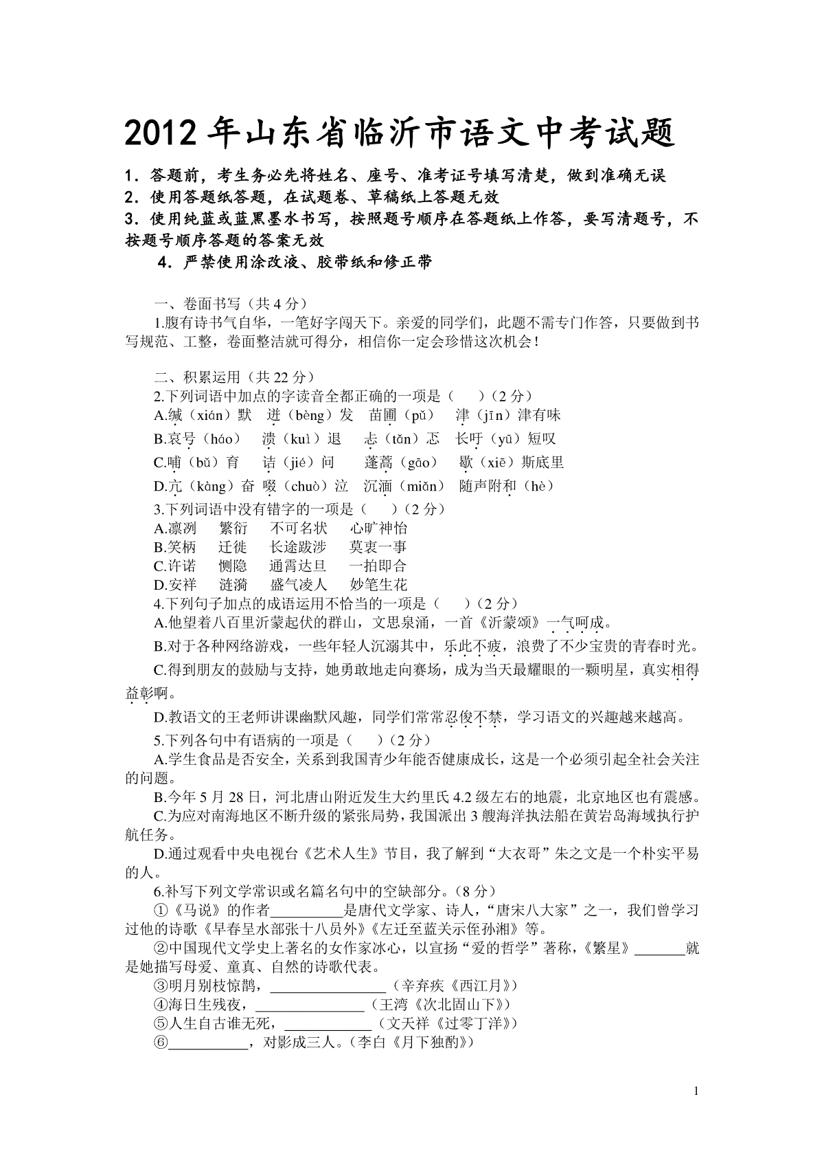 如果你想下载2012年山东省临沂市语文中考试题+答案DOC或PDF版,请点击本文末链接!