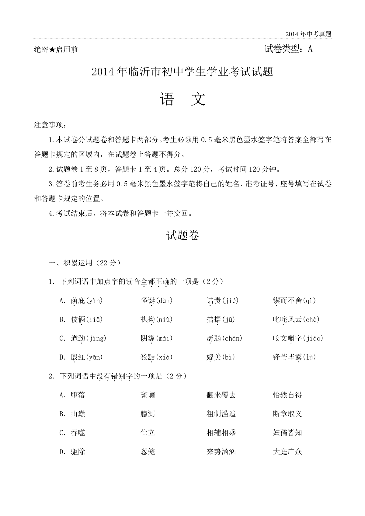下载2014年山东省临沂市语文中考试题+答案PDF格式或doc