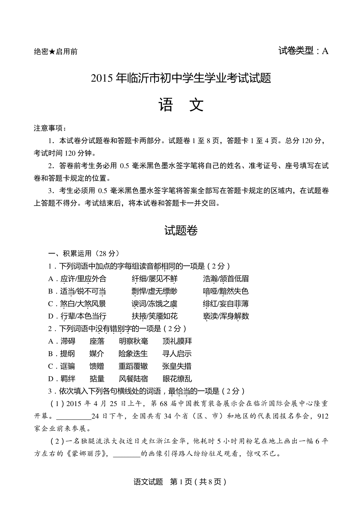 1.2015年山东省临沂市语文中考试题+答案