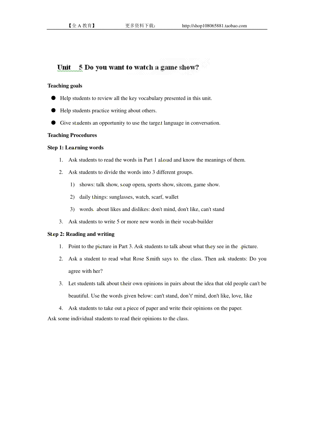 如果你想下载八年级英语上册教案:Unit 5 Do you want to watch a game show(DOC或PDF版,请点击本文末链接!