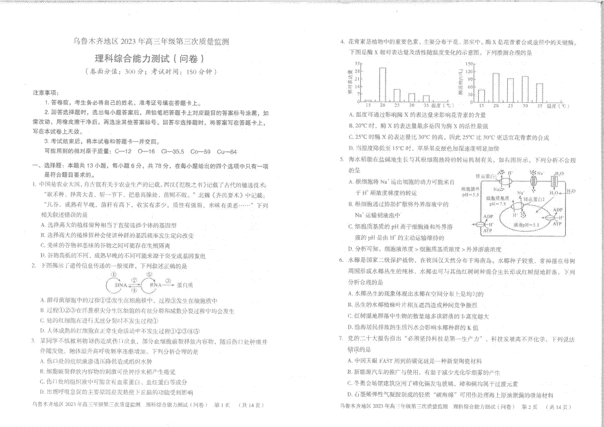 下载2023乌鲁木齐三模高三理综问卷PDF格式或doc