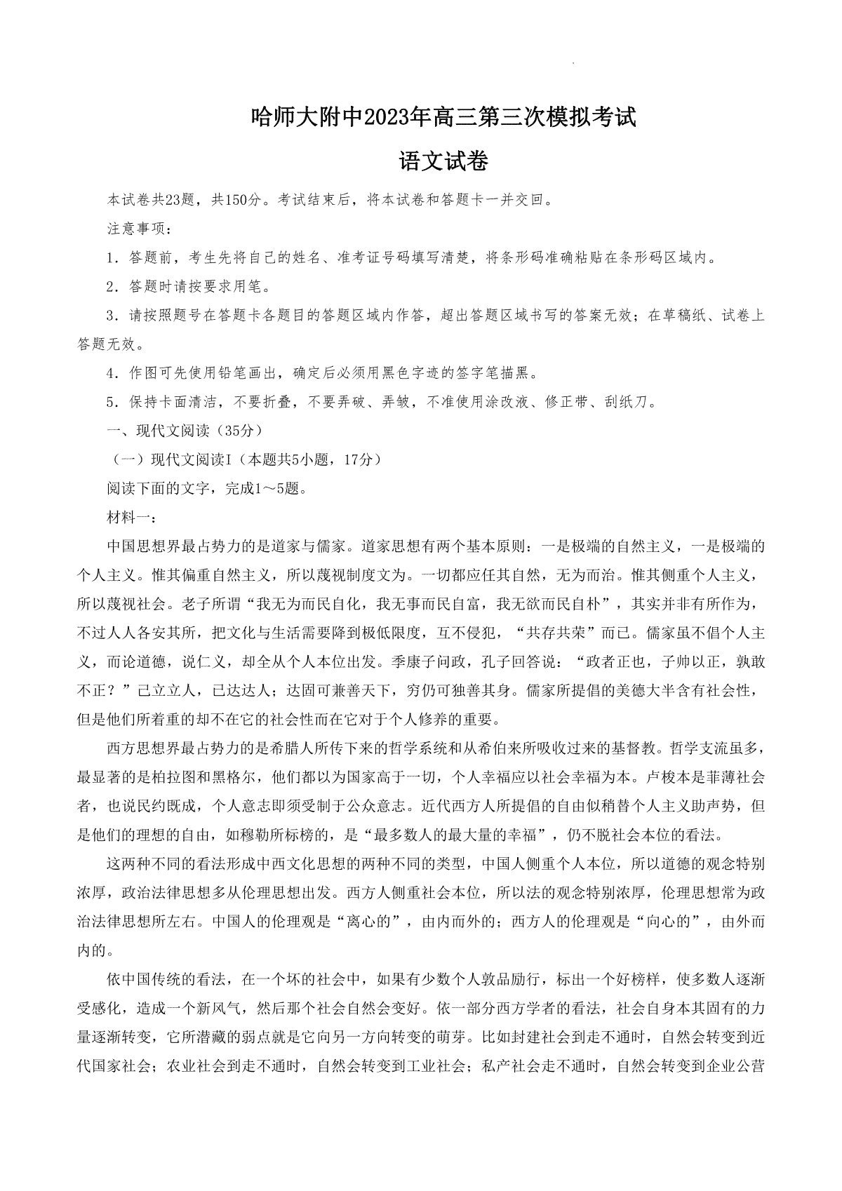 一、2023东北三省三校三模高三语文
