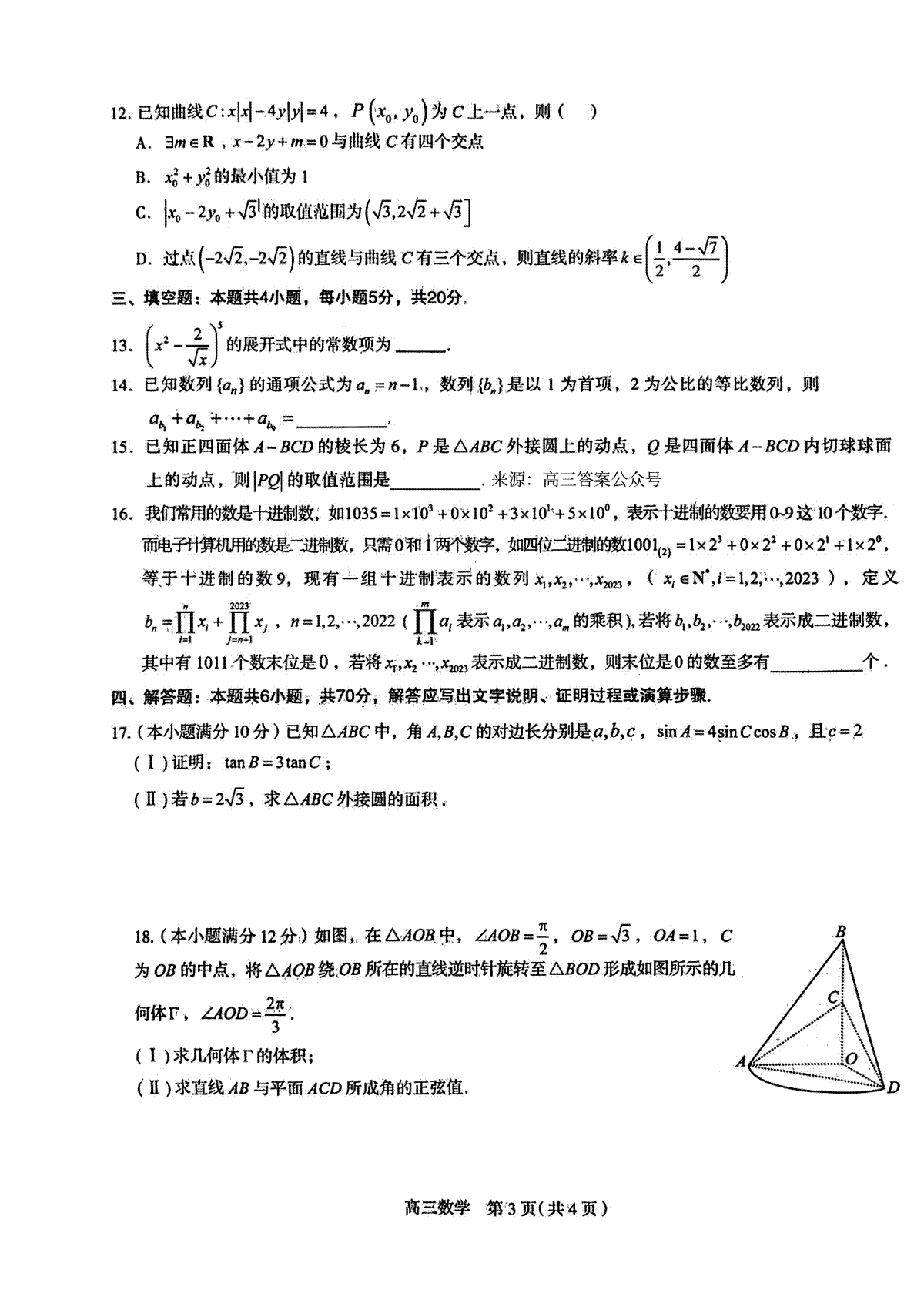 2023届黑龙江省大庆市高三第三次模拟考试 数学答案