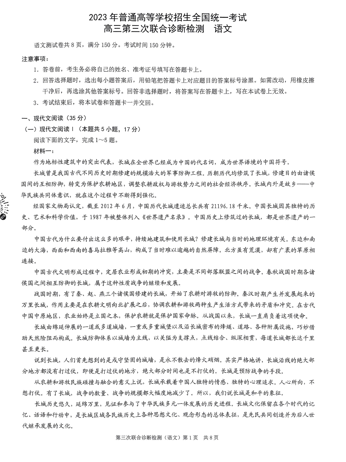 下载2023重庆三诊语文试题PDF格式或doc