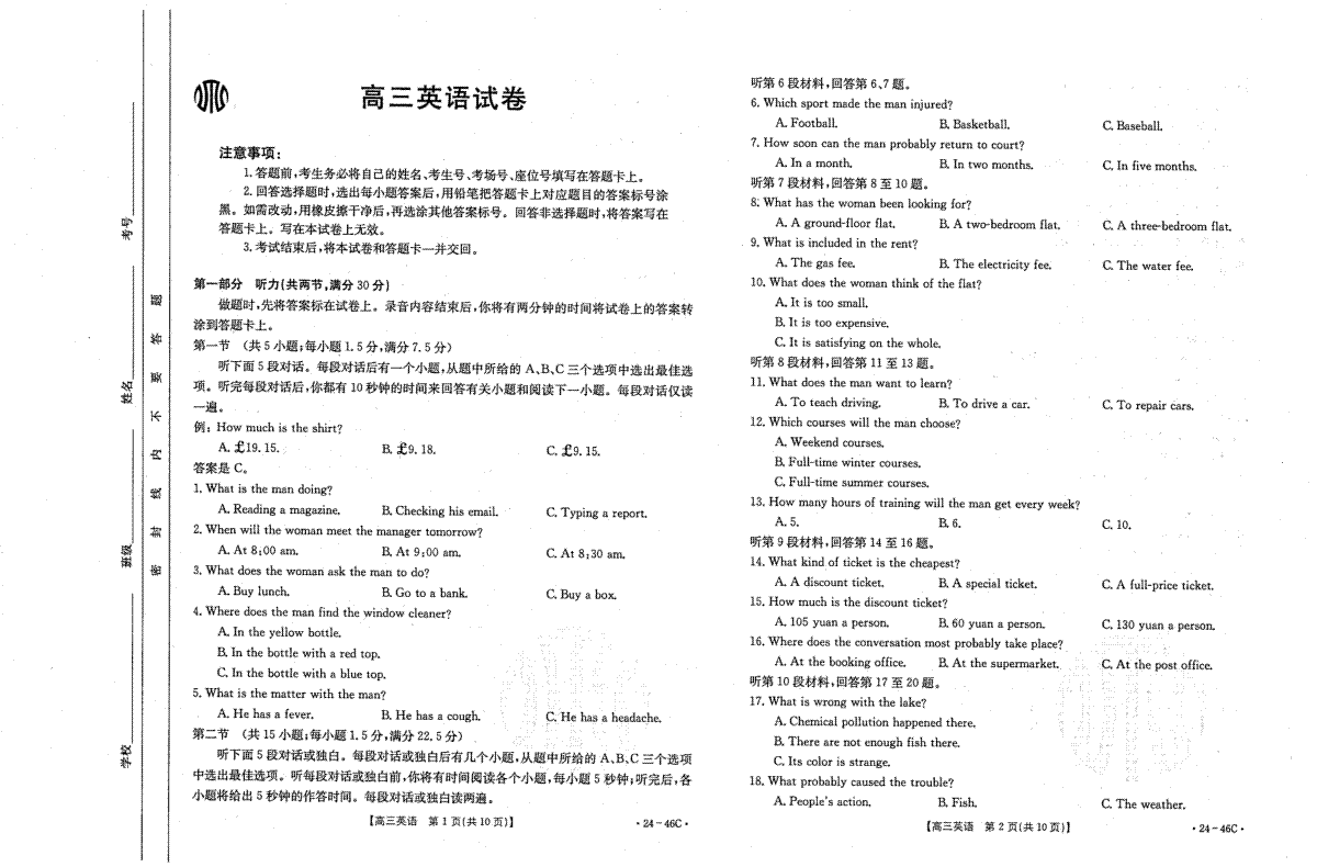 8.2023年10月新疆高三语文46C答案