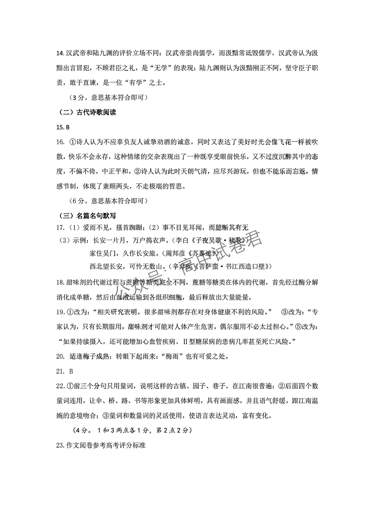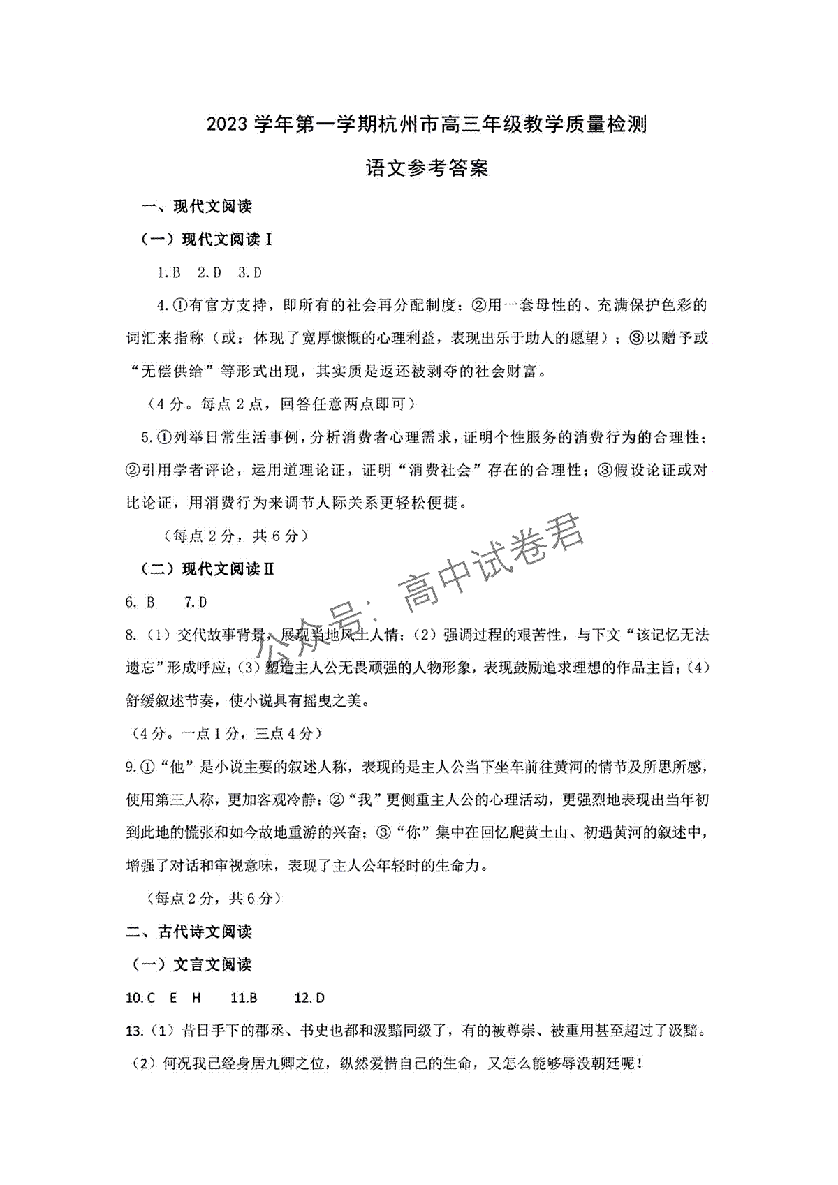 如果你想下载浙江省杭州市2023-2024学年高三上学期期中教学质量检测(一模)语文参考答案DOC或PDF版,请点击本文末链接!