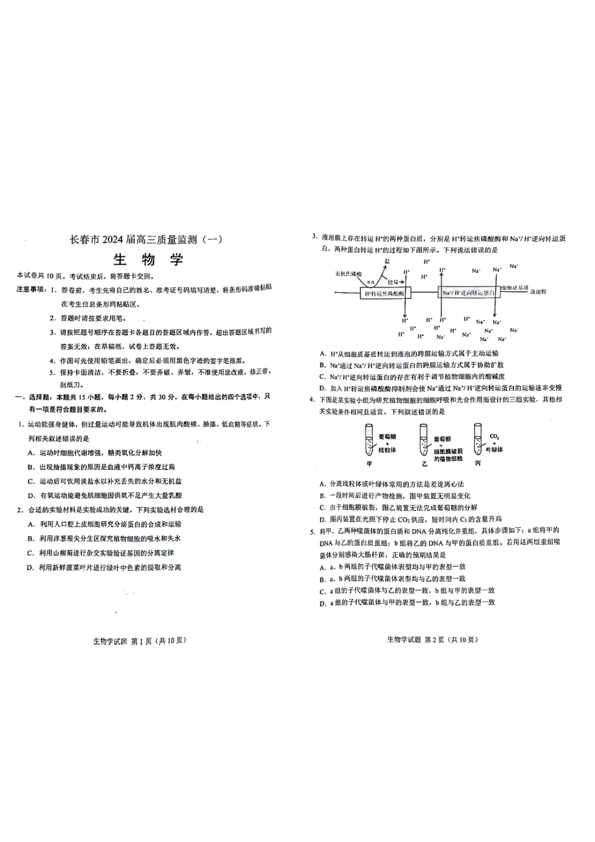 1.2024届吉林省长春市高三上学期质量监测(一)生物