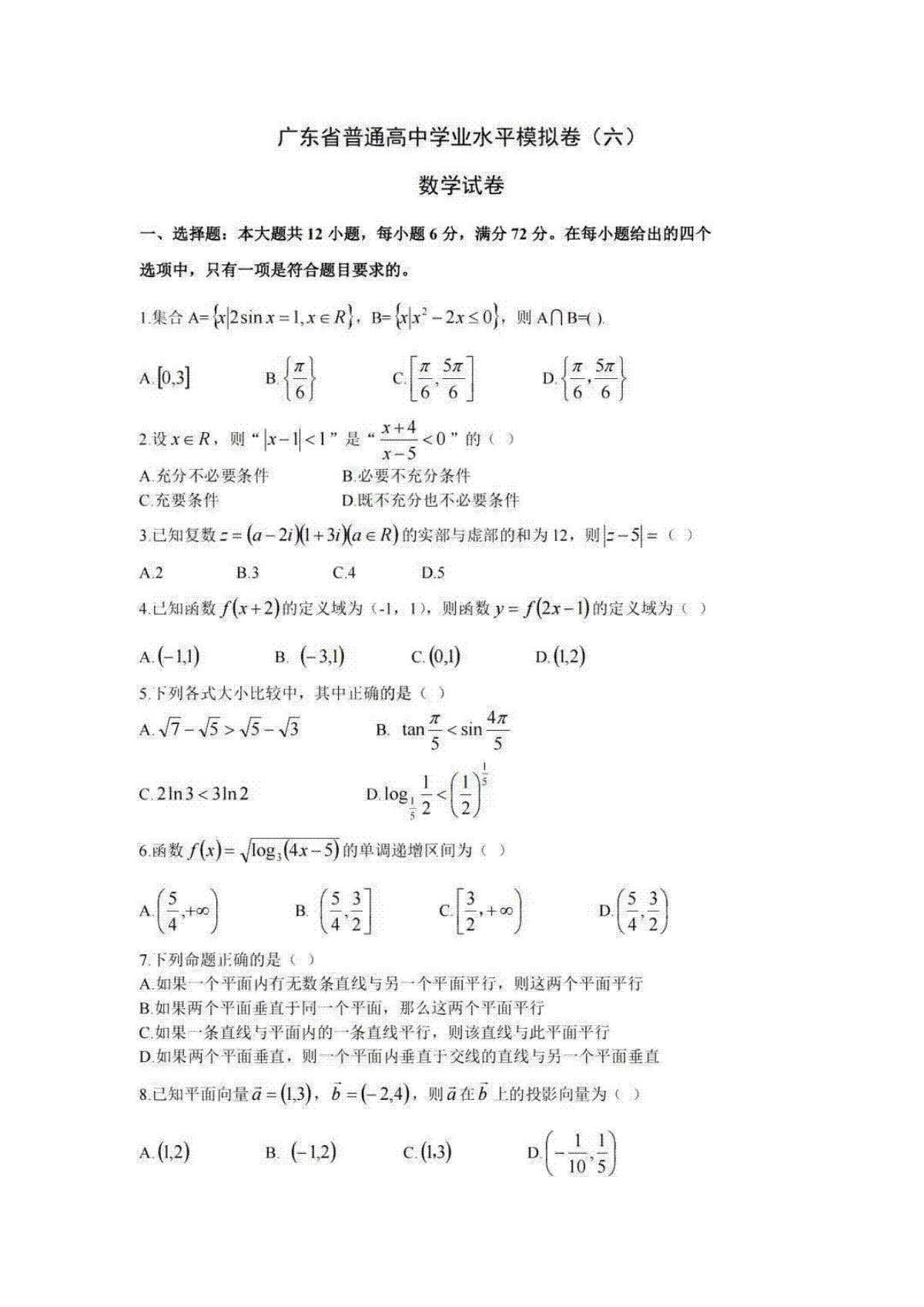 下载广东省春季高考模拟卷(6)-数学试题 答案PDF格式或doc