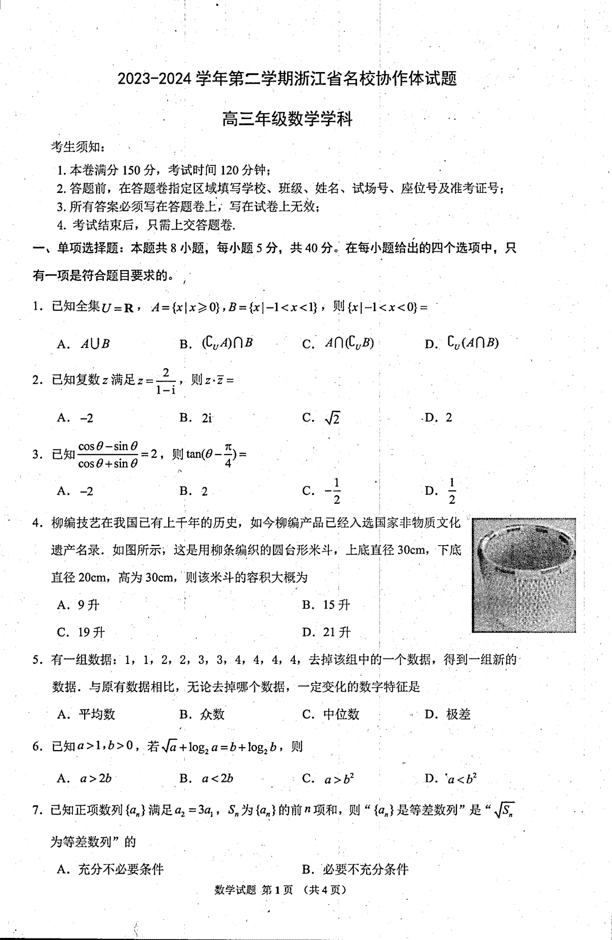 1.浙江省名校协作体2023-2024学年高三下学期开学联考数学试题