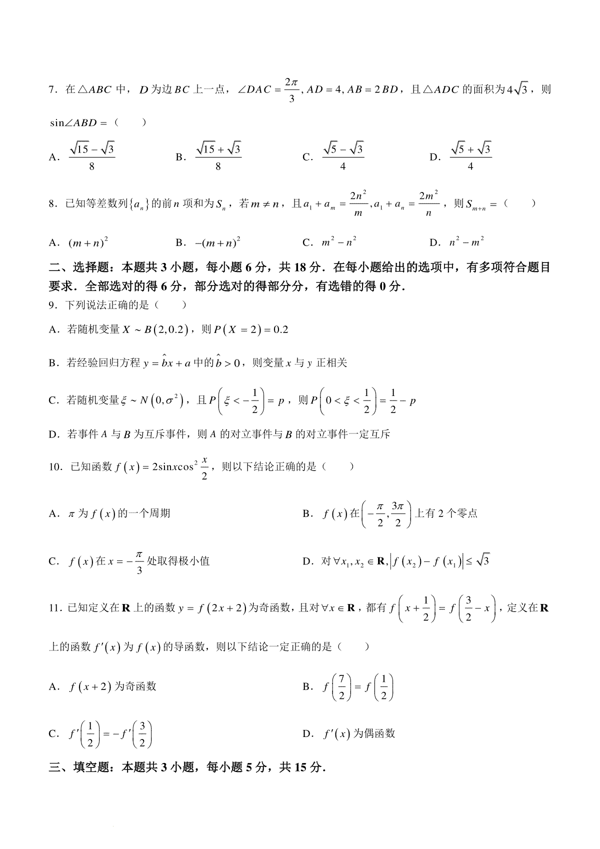 一、百师联盟2023-2024学年高三下学期开学摸底联考(新高考卷)数学试题