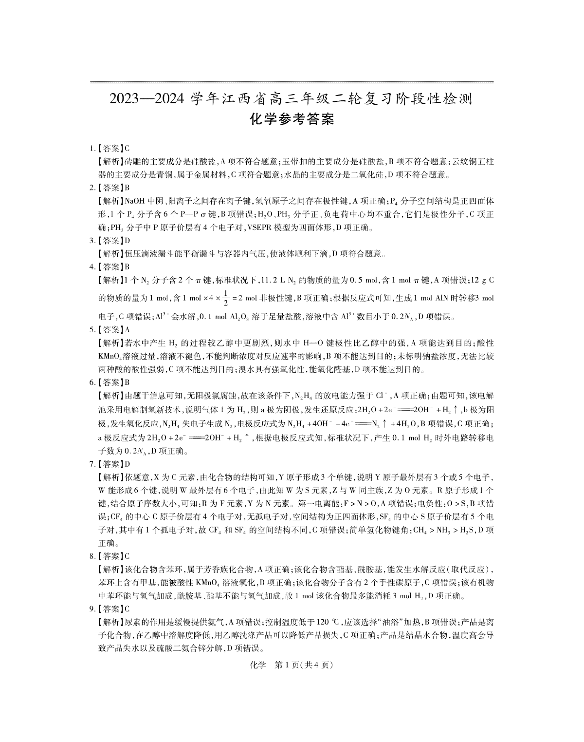 1.2024届江西省高三下学期二轮复习阶段性检测(二模)化学答案