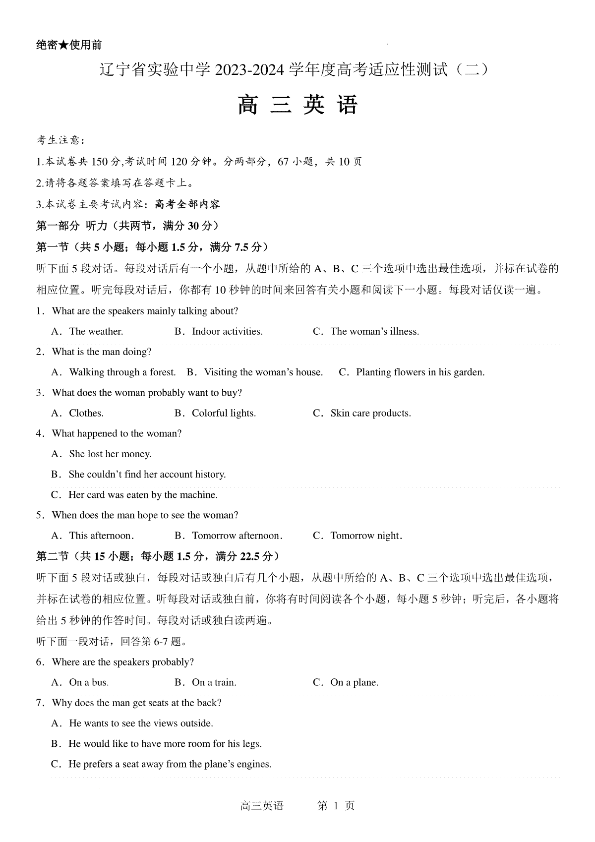 1.辽宁省实验中学2023-2024学年度高考适应性测试(二)英语