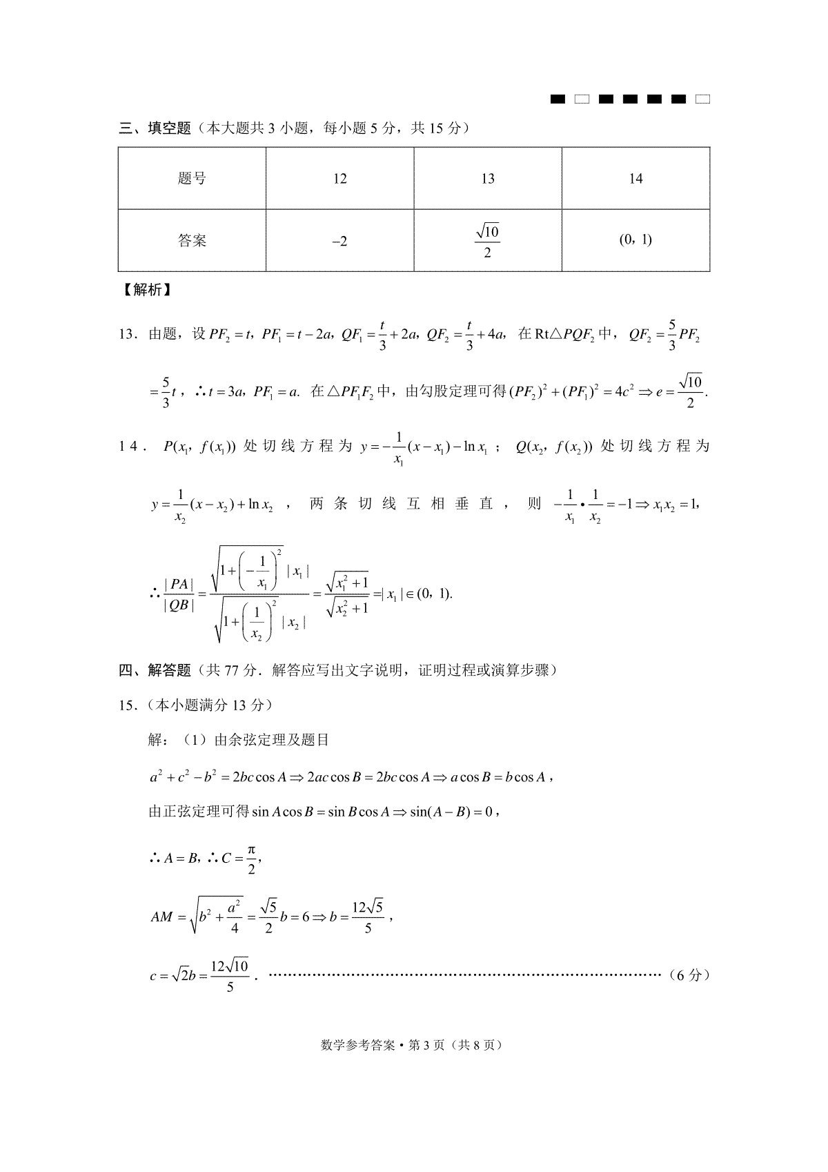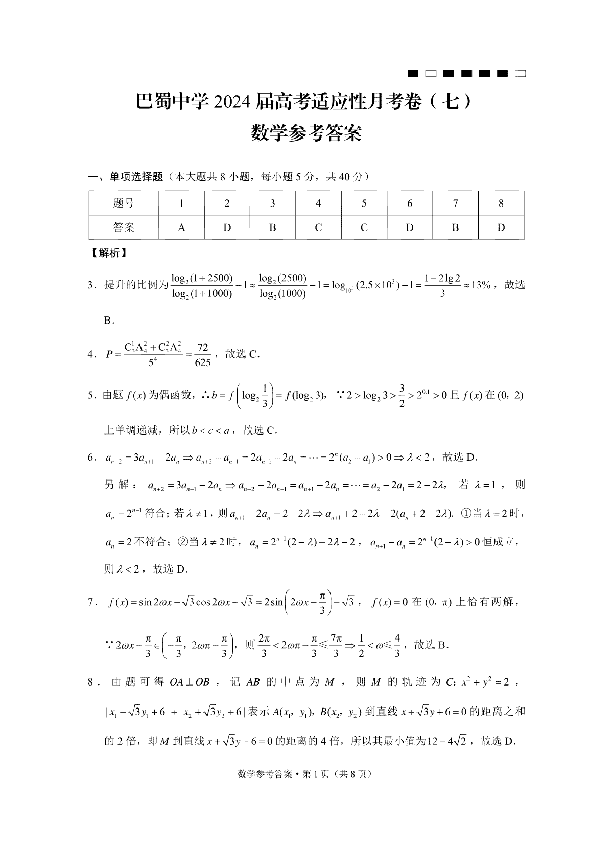 一、巴蜀中学2024届高考适应性月考卷(七)数学-答案