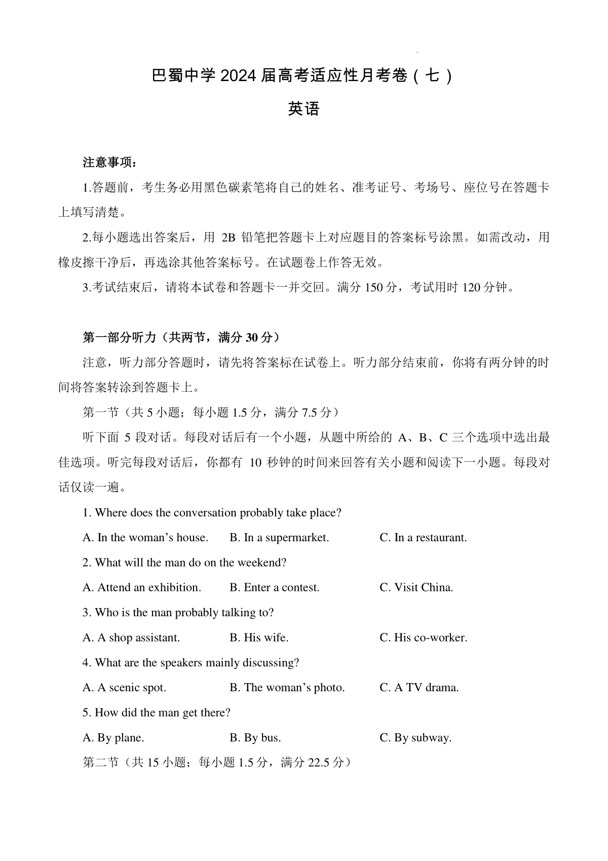 1.重庆市巴蜀中学2023-2024学年高三下3月月考英语试题