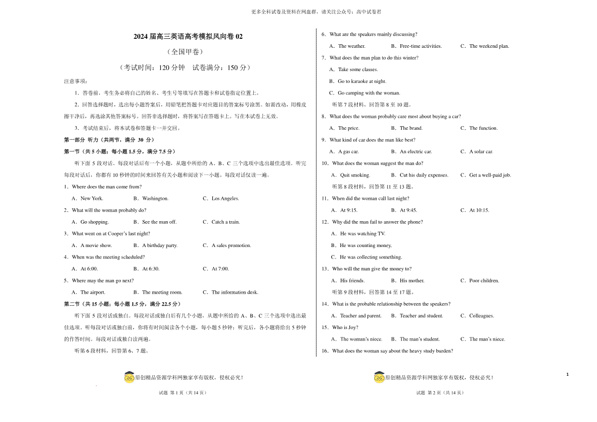 一、(全国甲卷) 2024届高三英语高考模拟风向卷02考试版A3
