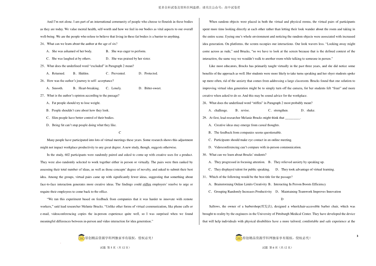 5.(新高考九省卷) 2024届高三英语高考模拟风向卷02考试版A3