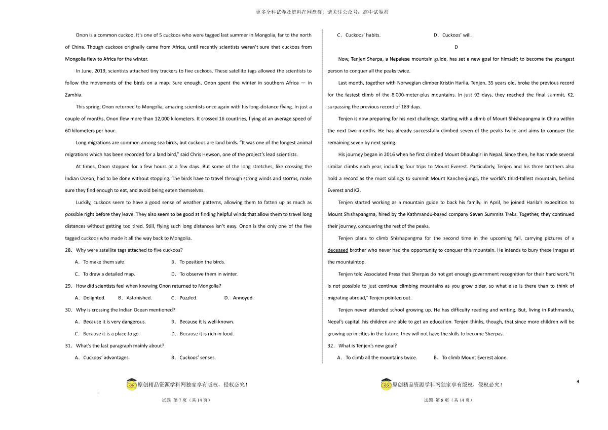 8.(新高考九省卷) 2024届高三英语高考模拟风向卷02考试版A4