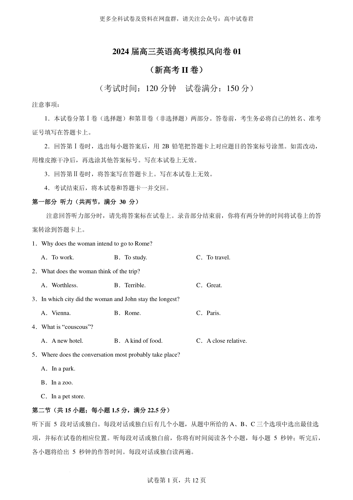 如果你想下载2024届高三英语高考模拟风向卷01(新高考II卷)考试版A4DOC或PDF版,请点击本文末链接!