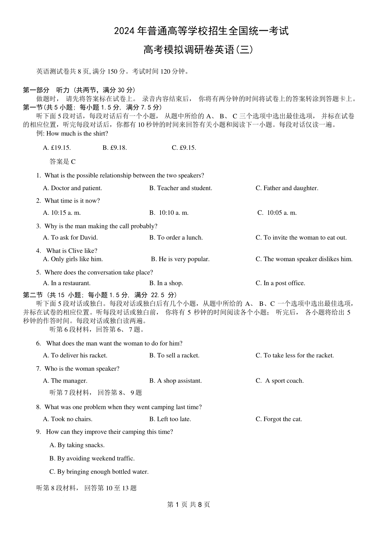 1.重庆康德2024年普通高等学校招生全国统一考试高考模拟调研卷(三)英语试题