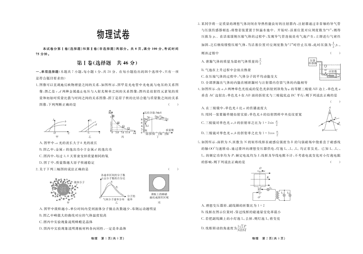 一、2024河北省部分高中高三一模物理