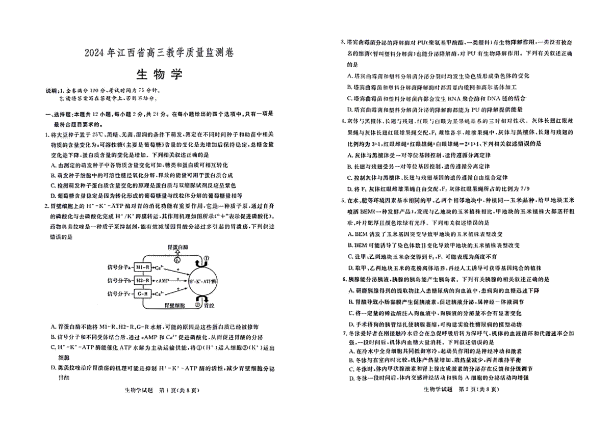 一、2024年江西省部分学校高三下学期4月教学质量监测生物试题